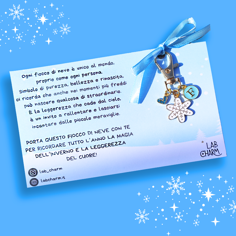 Ogni portachiavi ha 3 ciondoli: iniziale del nome, fiocco di neve e cuoricino con zirconi azzurri E' accompagnato da una cartolina illustrata che racconta la sua storia e il suo significato. Ideale come regalo di Natale, pensierino per amici, colleghi o familiari — un gesto piccolo ma pieno di calore.